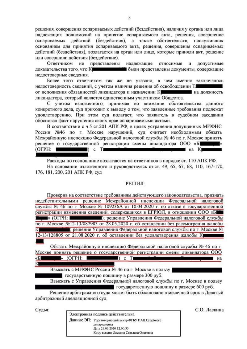 Разработана правовая позиция, согласно которой налоговый орган не имел основания для отказа в смене ликвидатора, подана обязательная досудебная жалоба в вышестоящий налоговый орган, а затем подготовлено и подано заявление в арбитражный суд о признании оспариваемого решения незаконным и обязании налогового органа сменить ликвидатора, также принято участие во всех судебных заседаниях.