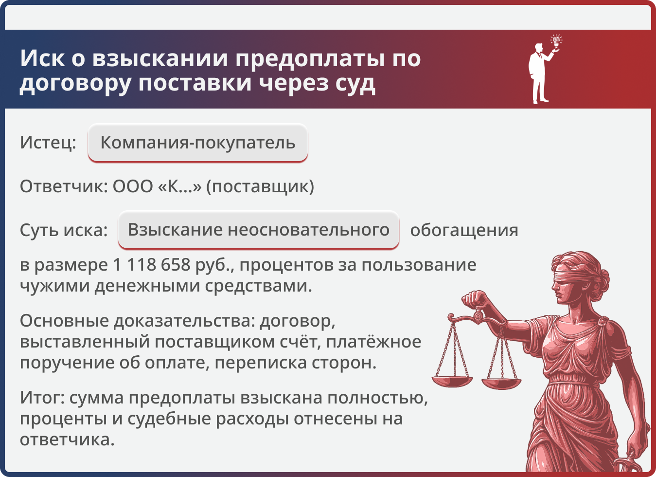 Иск о взыскании 1 118 658 руб. предоплаты по договору поставки