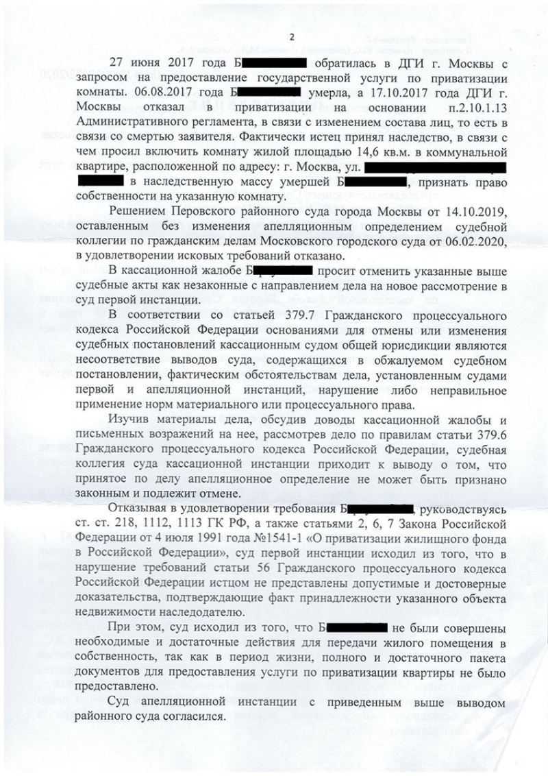 Клиент адвоката – П. обратилась с нестандартной просьбой. В период рассмотрения заявления ее сестры о приватизации жилого помещения она умерла и ее единственным наследником остался отец – Б. Клиент П., при этом, от наследства умершей сестры отказалась. Департамент городского имущества незаконно отказал в приватизации квартиры с нарушением срока, уже после смерти сестры. Суды первой и апелляционной инстанций отказали в удовлетворении иска о включении жилого помещения в наследственную массу умершей и признании за отцом умершей – Б. права собственности.