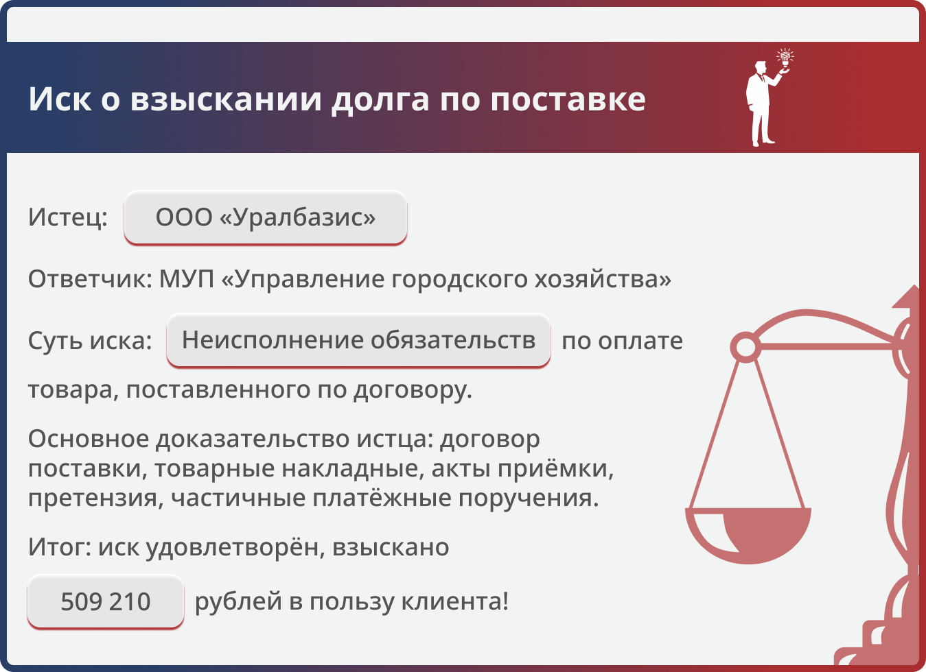 Контрагент перестал платить за поставленный товар, ссылаясь на свои проблемы. Мы изучили практику региона, подготовили претензию, подали иск и добились взыскания всей суммы долга, неустойки и судебных издержек.