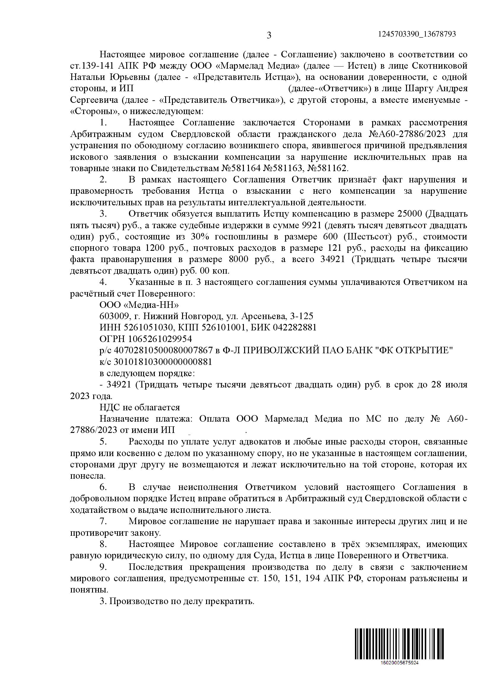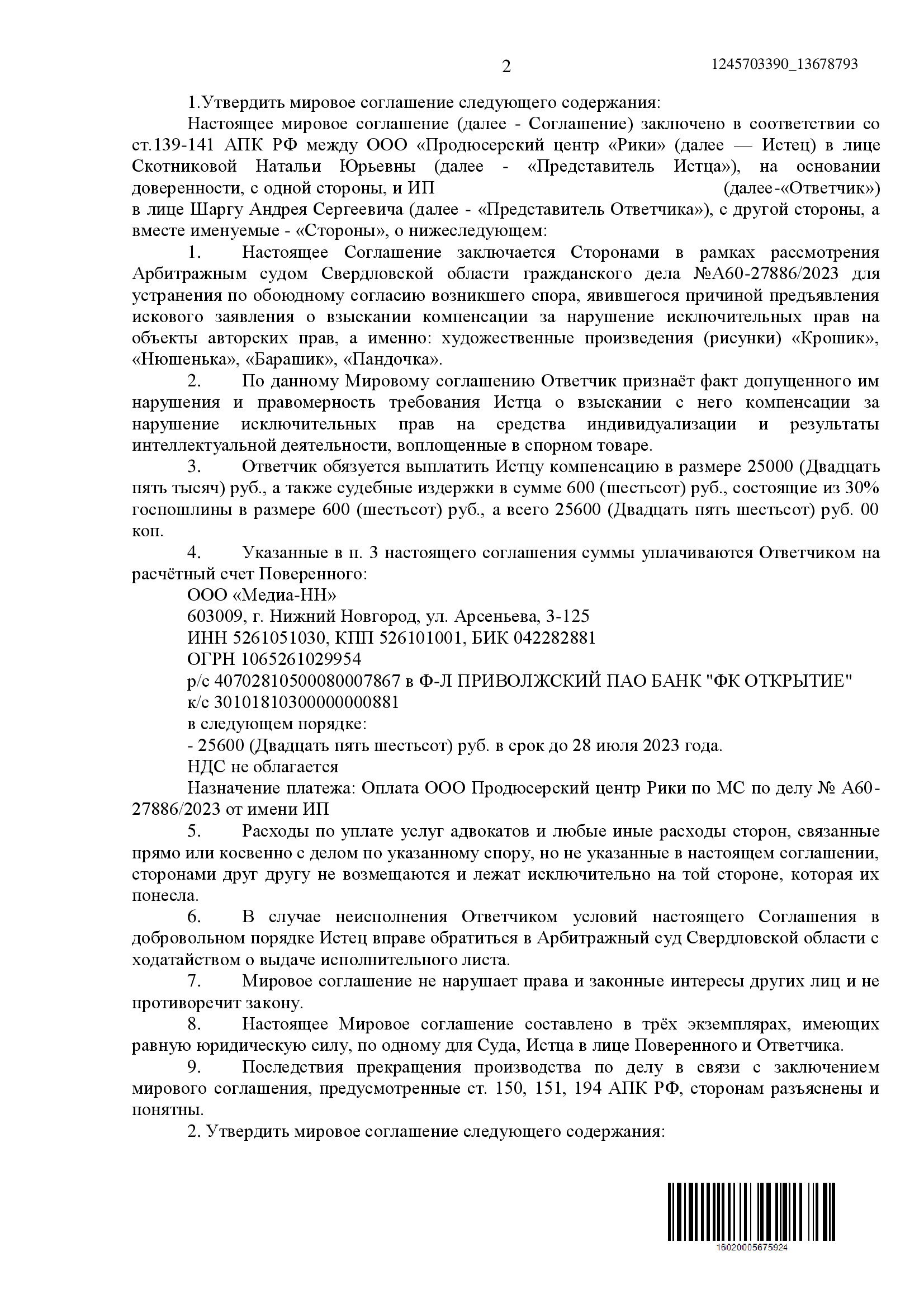 Истцы (ООО «Мармелад Медиа» и ООО «Продюсерский центр «Рики») обратились в Арбитражный суд Свердловской области с иском к ИП о взыскании 100 000 руб. компенсации за нарушение исключительных прав на товарные знаки и художественные произведения (рисунки) персонажей анимационного сериала «Малышарики»: «Крошик», «Нюшенька», «Барашик», «Пандочка». В ходе рассмотрения дела стороны заявили о заключении мирового соглашения и представили его текст на утверждение суда.