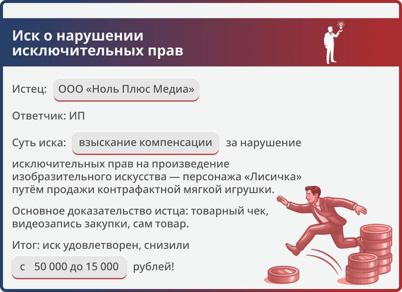 Правообладатель персонажа «Лисичка» требовал компенсацию за продажу контрафактной игрушки. Юристы компании обосновали несоразмерность суммы, и суд снизил компенсацию в 3,3 раза — до 15 000 руб.
