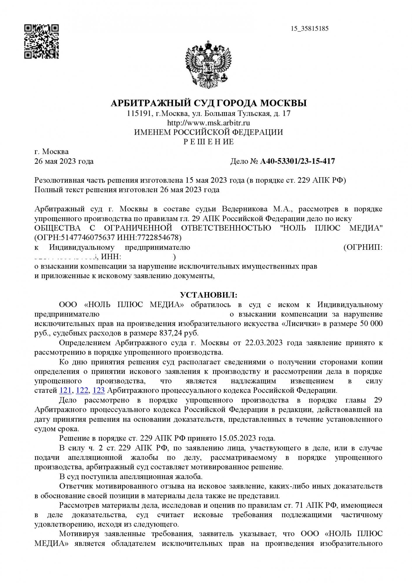 Истец (ООО «Ноль Плюс Медиа») обратился в суд с иском к ИП о взыскании 50 000 руб. компенсации за нарушение исключительных прав на произведение изобразительного искусства — персонажа «Лисичка» из анимационного сериала «Ми-ми-мишки». Основание — продажа 21 ноября 2022 года в торговой точке в г. Москве контрафактной мягкой игрушки. Дело рассмотрено в порядке упрощённого производства.