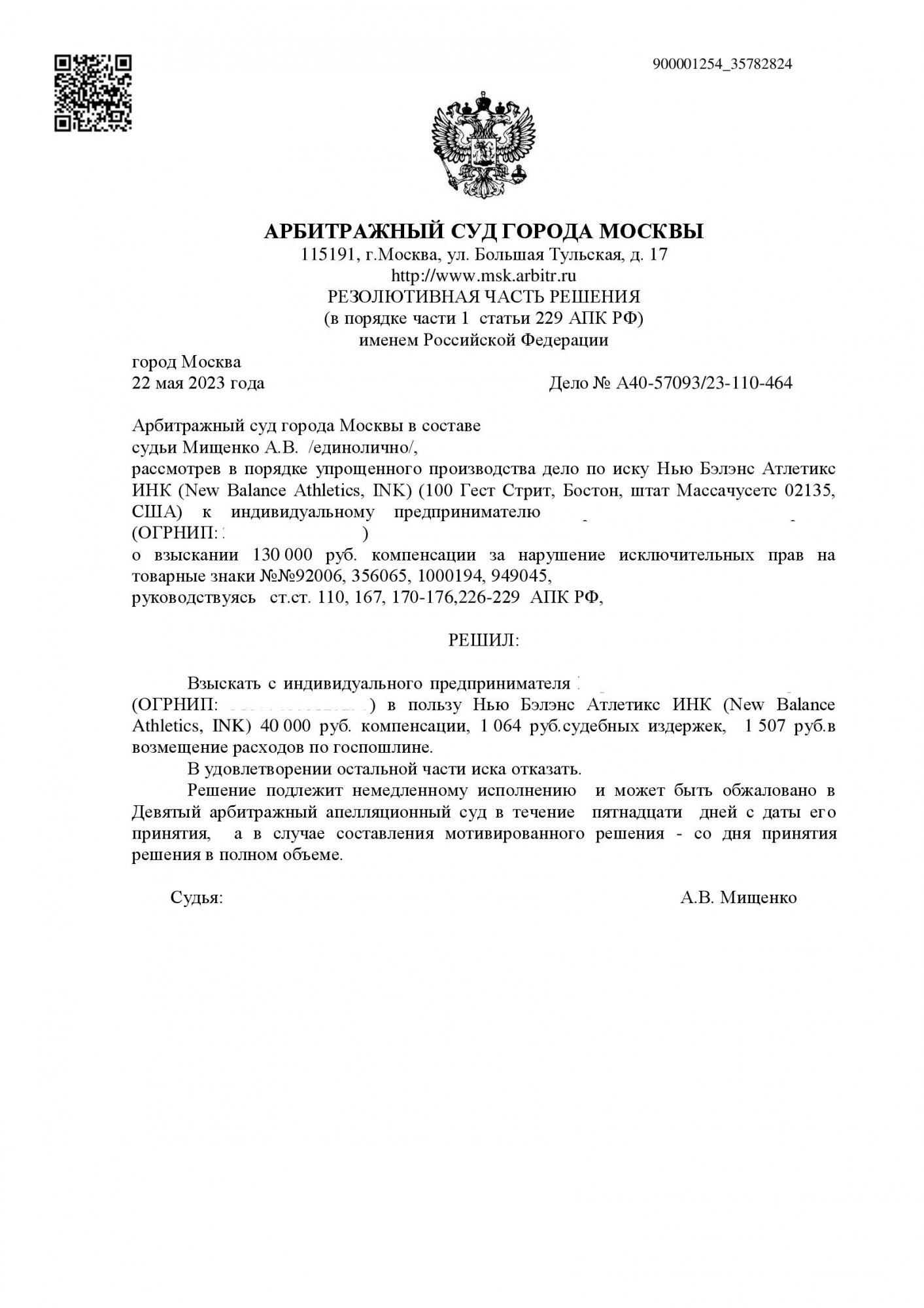 Истец требовал компенсацию за нарушение прав на товарные знаки New Balance. Юристы компании обосновали несоразмерность суммы, и суд снизил компенсацию более чем в 3 раза — до 40 000 руб.