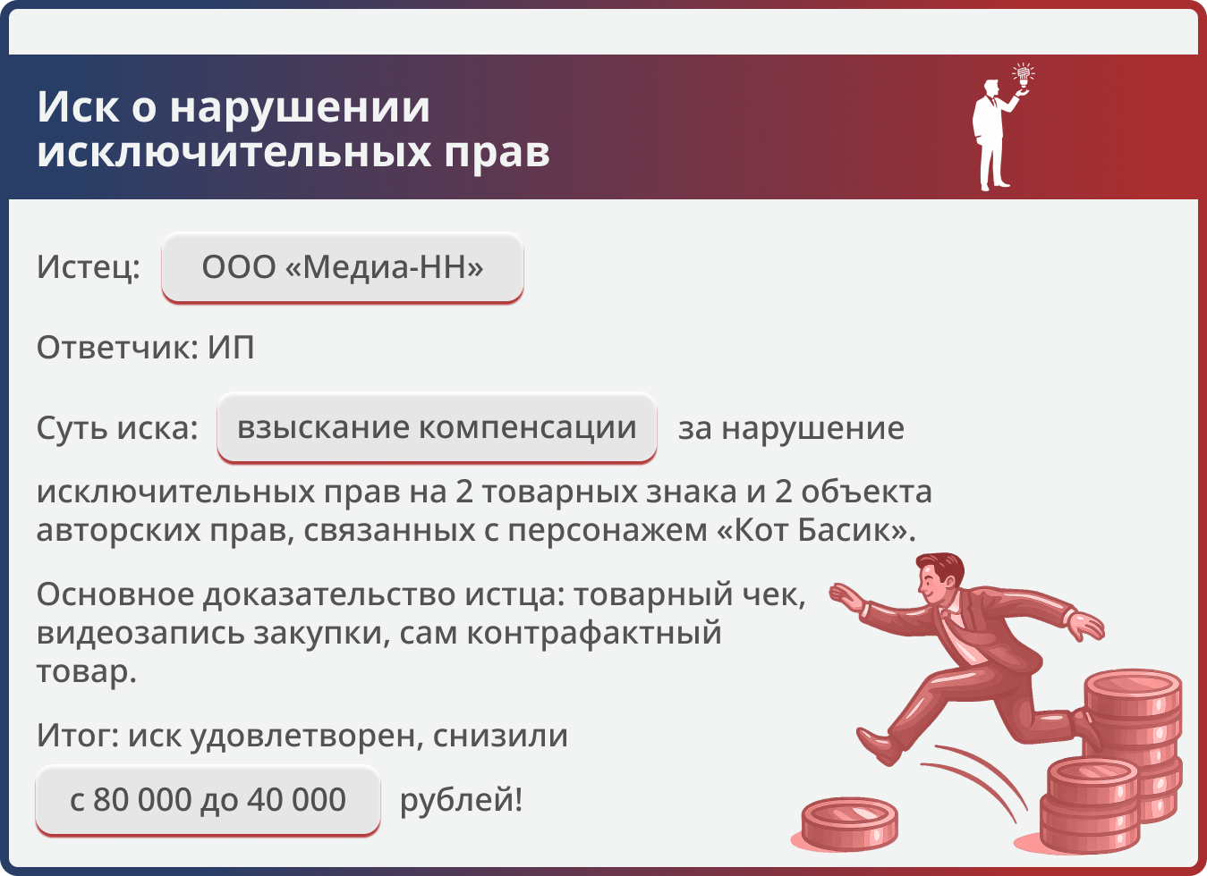 Истец (ООО «Медиа-НН») обратился в суд с иском к индивидуальному предпринимателю Амбарджная Акопу Григорьевичу о взыскании 80 000 руб. компенсации за нарушение исключительных прав на два товарных знака, а также на объекты авторских прав — дизайн «Мягкая игрушка кот Басик» и произведение изобразительного искусства «Мордочка Басика». Основанием послужила реализация ответчиком товара, содержащего указанные обозначения.