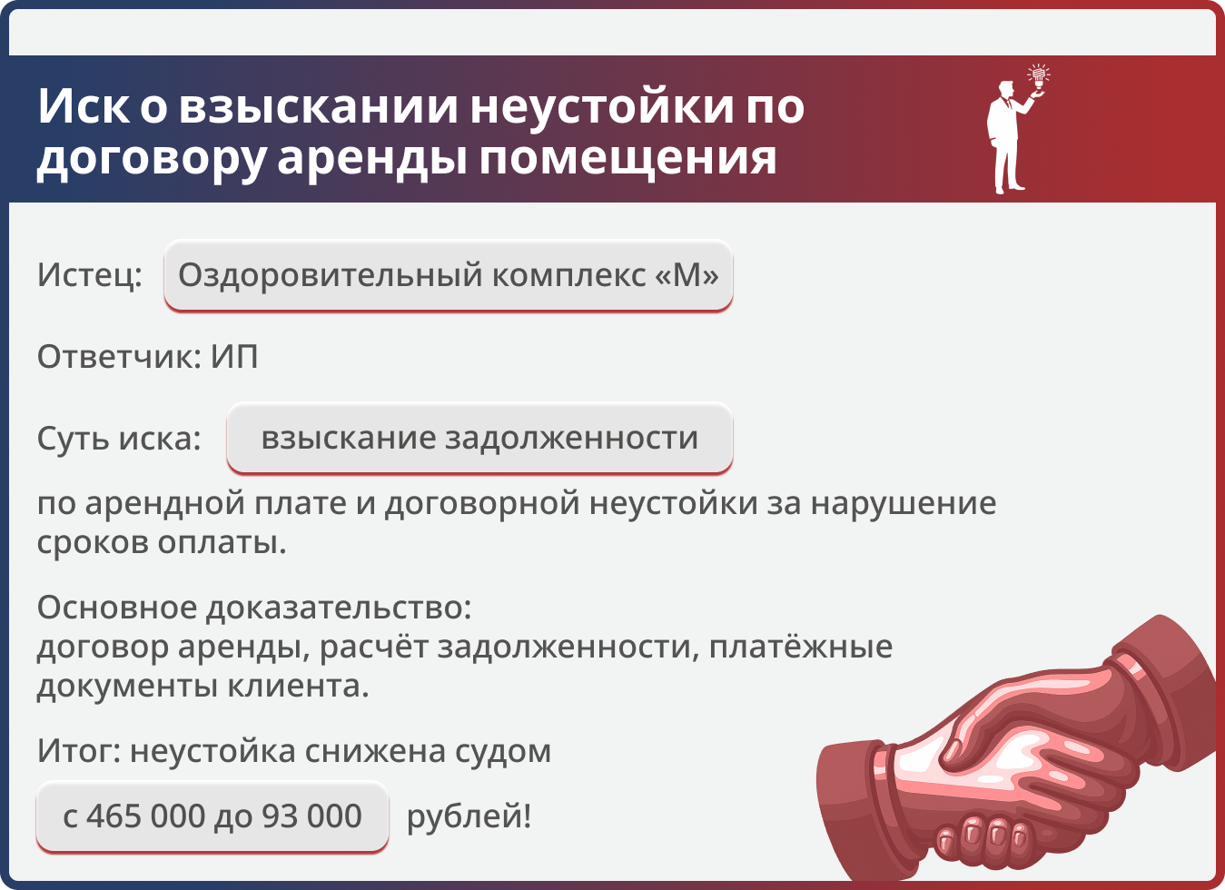 Основной долг (700 000 рублей) клиент признал и выплатил. Таким образом, общая сумма взыскания с нашего клиента оказалась значительно ниже первоначальных требований арендодателя.