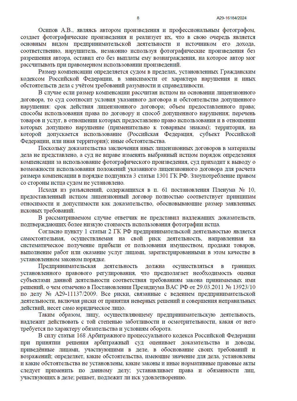 Арбитражный суд Республики Коми полностью удовлетворил наши требования. Суд признал, что использование фотографии без указания имени автора (Осипова А.В.) не может быть признано свободным цитированием, а срок исковой давности не пропущен.