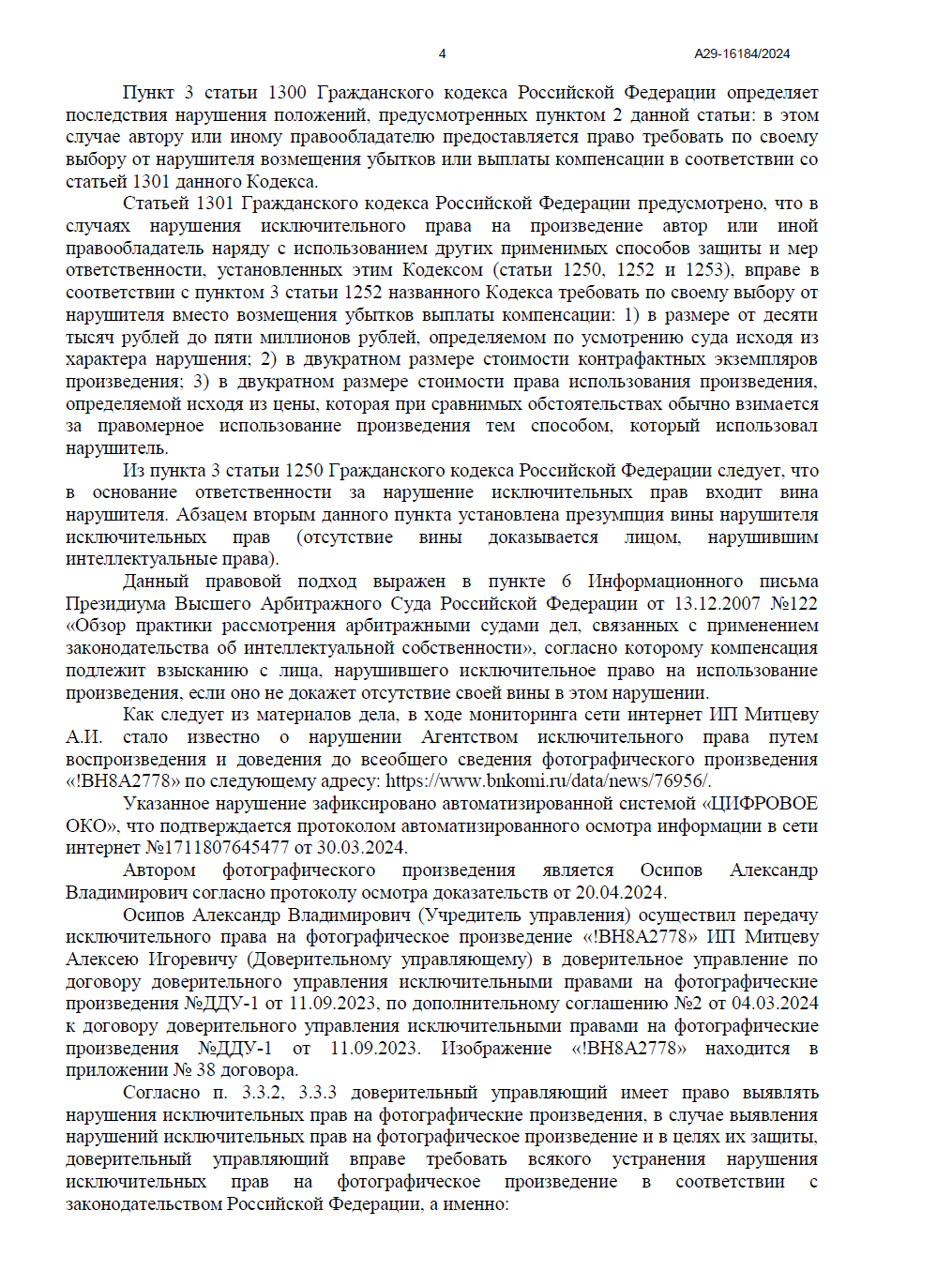 • Согласно закону, срок исковой давности начинает течь не с момента совершения нарушения, а с момента, когда правообладатель узнал или должен был узнать о нем. Мы предоставили суду доказательства, что о нарушении стало известно только 30 марта 2024 года в процессе целевого мониторинга. Суд полностью принял нашу позицию, отклонив довод Ответчика.
